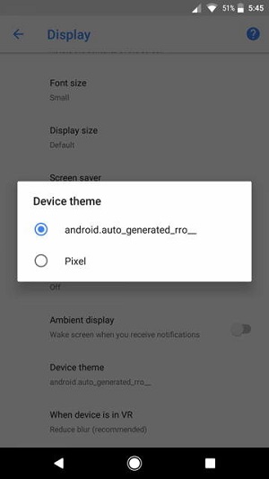 در بیلد جدید نسخه آزمایشی اندروید O، تنظیمات جدیدی در بخش "Display" وجود دارد که به کاربر، اجازه میدهد تا بین دو تم مختلف جابهجا شود. در صورتیکه این تغییرات مطلوب کاربران باشد، احتمالاً در نسخه نهایی سیستمعامل اندروید O گزینههای بیشتری برای شخصیسازی سیستمعامل اندروید اضافه خواهد شد و حتی کاربران میتوانند نسخه خام اندروید O را مطابق با سلیقه خود شخصیسازی نمایند. به عبارت بهتر، انتظار میرود که برای انتخاب تمهای مختلف به گزینههای پیشفرض سیستمی محدود نباشید.