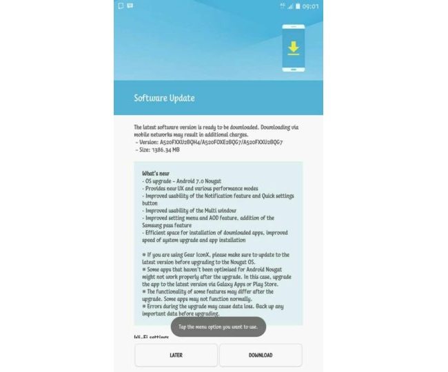 براساس این تصویر این بهروز رسانی در حدود 1.3 گیگابایت حجم دارد و علاوه بر ویژگیهای جدید اندروید نوقا، یک رابط کاربری جدید، قابلیت نمایش چند پنجره به صورت همزمان، سیستم جدید نمایش اعلانها و نسخه جدید از برنامه Always On Display را هم در اختیار کاربران قرار میدهد.