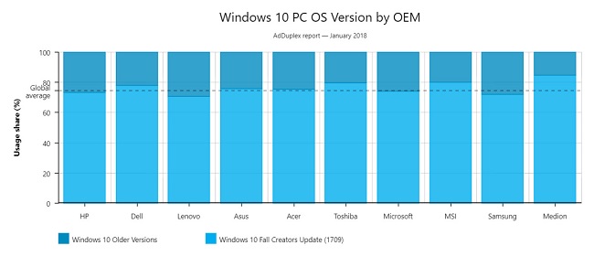 در بخش دیگری از این گزارش، به بررسی تعداد محصولات سخت افزاری که به آخرین نسخه از ویندوز 10 مجهز شدهاند پرداخته شده است. براساس این اطلاعات، بیشترین ارتقا به این نسخه در دستگاههای تولید شده توسط کمپانیهای Medion، MSI، توشیبا و Dell صورت گرفته است. نکته جالب در این ردهبندی قرار گرفتن محصولات مایکروسافت در رتبههای پایین است که نشان میدهد این کمپانی در ارتقا محصولاتی نظیر لپتاپ های سرفیس و تبلتهای سرفیس پرو، عملکرد چندان خوبی نداشته است. به نظر میرسد فقدان ابزار Media Creation Tool برای این دستگاه دلیل اصلی این اتفاق بوده است.