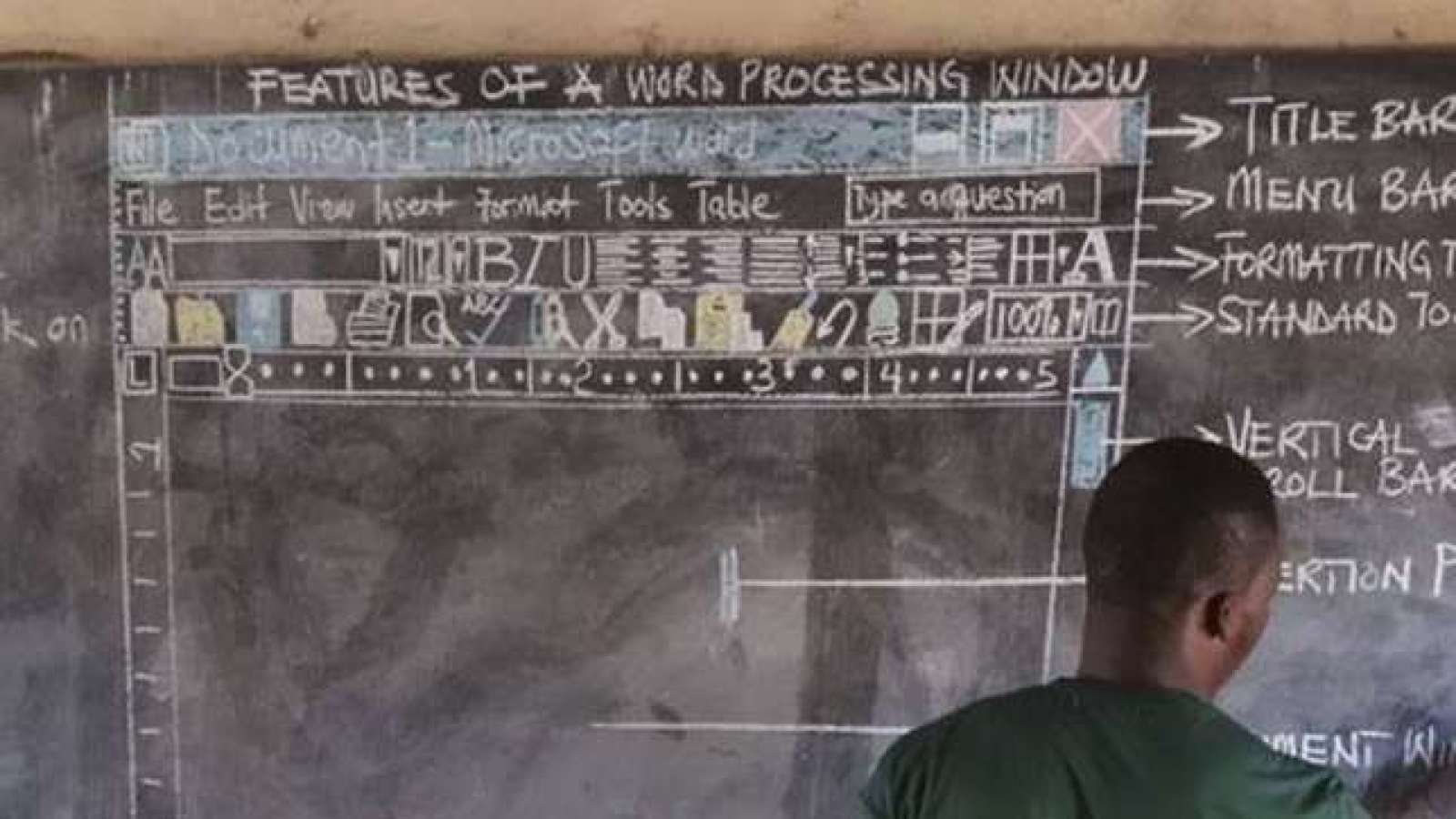 یک معلم اهل کشور آفریقایی غنا که به دلیل محرومیت در کلاس درس دارای کامپیوتر نیستند، با کشیدن جزئیات دقیق محیط کاربری آفیس به دانشآموزان خود درس میدهد.