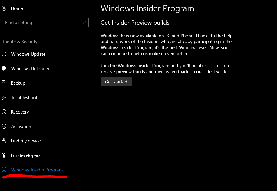 ابتدا به بخش Settings ویندوز رفته و در قسمت Update & Security بر روی Windows Insider Program کلیک کنید. طبق تصویر زیر توضیحاتی که دربارهی این بخش ارائه شده گزینهی Get Started را انتخاب کنید.