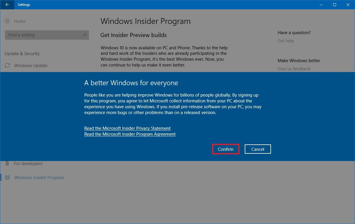 پس از انتخاب گزینهی اول (این همان بخش release preview است) و کلیک بر روی چندین مورد continue به صفحهی تایید هدایت میشوید و پس از آن سیستم ریستارت خواهد شد. پس از ریستارت شما بخشی از Windows Insider Program خواهید بود و با چک کردن برای بروزرسانی بلافاصله یا همانطور که قبلاً ذکر شد بعد از چند ساعت این آپدیت در دسترس خواهد بود.