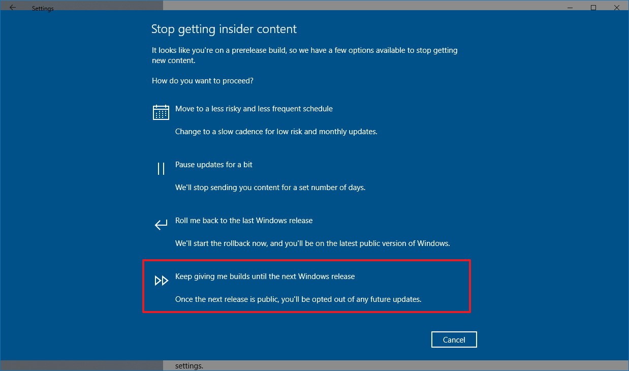 پس از آن گزینهی Keep giving me builds until the next Windows release را انتخاب کرده و سیستم را ریاستارت کنید.