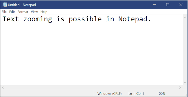 یکی از تغییرات جدید امکان زوم کردن یا بزرگ نمایی متن است که در نسخه آزمایشی از آپدیت Redstone 5 ویندوز 10 در دسترس است. برای بزرگ نمایی متن میتوان از کلید ترکیبی ctrl با دکمه میانی ماوس استفاده کرد. همچنین نوار وضعیت جدید موقعیت مکان نمای ماوس، ستونها و کدگذاری کاراکترها را نشان میدهد.
