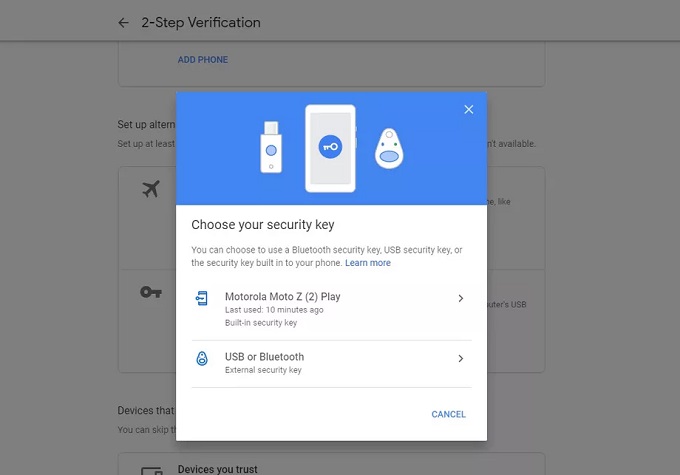 برای فعال سازی این قابلیت شما نیاز به یک گوشی هوشمند اندرویدی مجهز به اندروید نسخه 7 و بالاتر خواهید داشت و در قدم دوم باید آخرین نسخه مرورگر کروم را بر روی یکی از دستگاههای مجهز به سیستم عامل Chrome OS ،macOS یا ویندوز 10 نصب کنید. در ابتدا با گوشی اندرویدی خود وارد حساب کاربری مورد نظر شوید و بلوتوث دستگاه اندرویدی خود را روشن کنید. سپس با استفاده از کامپیوتر خود با استفاده از مرورگر کروم وارد لینک myaccount.google.com/security شوید و بر روی گزینه تایید دو مرحلهای یا two-step verification کلیک کنید. گزینه کلید امنیتی را انتخاب کنید و گوشی اندرویدی خود را به عنوان دانگل امنیتی فیزیکی در منو مورد نظر انتخاب کنید.