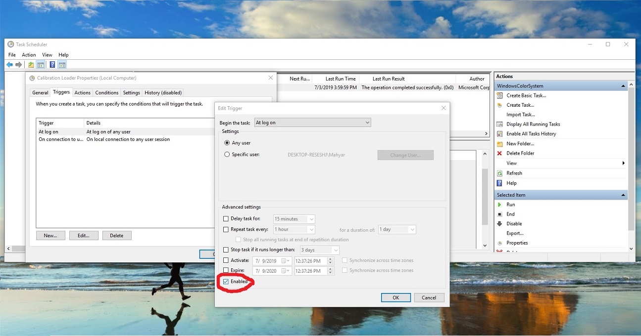 در سمت راست بر روی گزینه Calibration Loader دو بار کلیک کنید و سربرگ Triggers را انتخاب کنید، سپس گزینه At Log on را انتخاب کنید تیک گزینه Enabled را بردارید تا به حالت Disable در بیاید. همین کار را برای گزینه دوم یعنی On connection to user session انجام بدهید. بعد از انجام تمام مراحل باید سیستم را یکبار خاموش و مجدداً روشن کنید. با این ترفند مشکل شما حل میشود و رنگ مانیتور به حالت طبیعی خود بر میگردد.