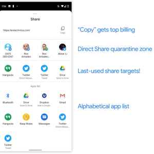 - منوی اشتراک گذاری سریعتر و کاربردیتر: گوگل برای این نسخه از اندروید منوی اشتراکگذاری جدیدی را تدارک دیده است که به کمک آن کاربران با سرعت بسیار بیشتری میتوانند نسبت به اشتراکگذاری محتوای مد نظر خود با افراد، نرمافزارها، سایتها و دیگر مخاطبین اقدام کنند. مشخصه اصلی این منو سرعت بیشتر آن است و ظاهر آن نیز کاربردیتر و زیباتر خواهد شد.