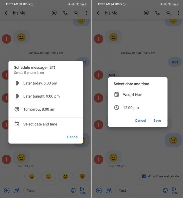 نحوه کار با این قابلیت به این صورت است که شما یک پیام را به صورت پیشنویس (Draft) آماده میکنید و سپس دکمه ارسال را به برای چند ثانیه نگه میدارید، در نهایت چهار گزینه برای شما نمایش داده میشود که سه گزینه آن زمانهای پیش فرض و گزینه چهارم زمان مورد نظر شما برای ارسال پیامک است.
