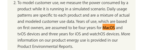 در بخشی از این اطلاعات اپل اعلام کرده است: "طول عمر محصولات عمدتاً به کاربران وابسته است اما می توان دوره عمر محصولات مبتنی بر سیستم عامل MacOS و tvOS را چهار سال و دستگاه های مبتنی بر iOS و WatchOS را سه سال در نظر گرفت."