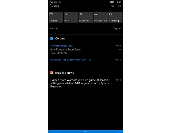 اعلان ها نیز هم اکنون با ظاهری جذاب تر و همراه با تصاویری بزرگتر در معرض دید کاربران قرار خواهد گرفت. از سویی دیگر، در نسخه جدید بخش Action Center قادر است اعلان های مربوط به Cortana را به نمایش در آورد. همچنین کاربران می توانند این اعلان ها را در سه عنوان Top، High و Normal اولویت بندی کنند و یا تعیین کنند که هر برنامه تا چه تعداد اعلان را به نمایش در آورد. علاوه بر این، بخش Action Center هم اکنون قابلیت جدیدی را در اختیار دارد که می تواند کلیدهای میانبری را برای کاربران تعریف نماید.