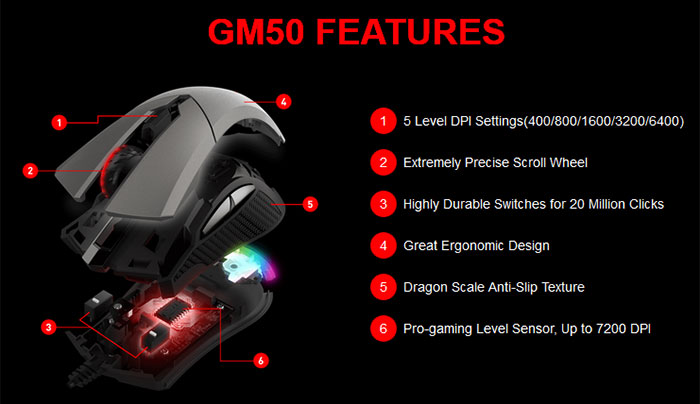 موس گیمینگ Clutch GM50 از بدنه سبک (87گرم) برای افزایش سرعت در بازیهای شوتر اول شخص بهره میبرد؛ همچنین این موس برای افراد راست دست طراحی شده و مانند اکثر موسهای گیمینگ از شش کلید بهره میبرد که دو کلید اصلی آن از سوئیچهای دقیق و با دوام Omron استفاده میکند. ام اس آی برای افزایش دقت این موس گیمینگ از سنسور نوری Pixart PMW 3330 با حداکثر دقت 7200DPi استفاده کرده است. دقت این موس با استفاده از کلید ویژه تعبیه شده بر روی آن در 5 حالت قابل تغییر است.