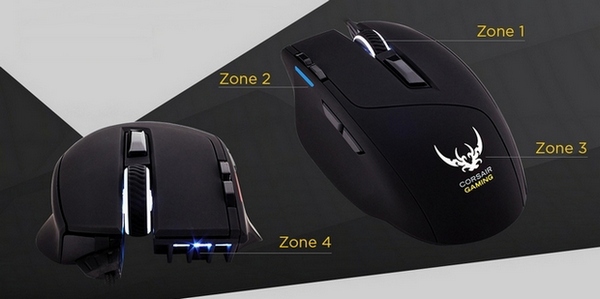چهار منطقه بر روی این ماوس طراحی شده است که هر کدام از آنها مجهز به یک LED رنگی جداگانه است و میتوان رنگ نورافشانی آنها را از طریق نرم افزار اختصاصی Corsair CUE از میان 16.8 میلیون رنگ طیف RGB انتخاب کرد.