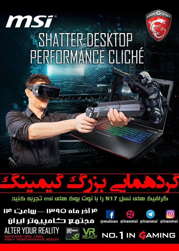 بخش لپتاپهای گیمینگ MSI که امروزه با محصولات خاص خود، به عنوان شرکتی پیشرو در صنعت گیمینگ شناخته میشود، قصد دارد دومین رویداد بزرگ گیمینگ خود را در تهران برگزار کند. این رویداد که از آن میتوان به عنوان «گردهمایی بزرگ گیمینگ» نام برد، در روز 4 آذرماه 95 در بازار کامپیوتر ایران (خیابان ولیعصر) برگزار خواهد شد.