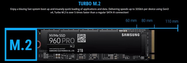 علاوه بر موارد 4 پورت ساتا شش، 2 پورت M.2 Socket3 32Gb/s با قابليت پشتيباني از SSD هايي با طول 42، 60، 80 و نهايتا 110 ميليمتر امکانات ذخيره سازي را کامل می کند تا سرعت بسیار بالای SSD های NVMe را در اختیار کاربران قرار دهد.