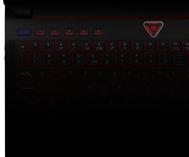 در بخش کیبورد میتوان دو تابش درخشان را مشاهده کرد که از نور زمینه سرخ برای بخش کیپد و از نور آبی برای بخش نامپد استفاده شده است. در این قسمت نیز کلیدهای حرکتی WASD و کلیدهای جهتنما کاملا مشخص هستند.