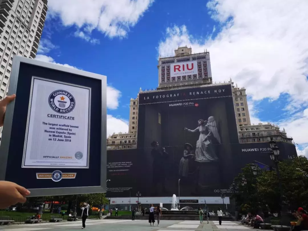بیلبورد غول آسایی از HUAWEI P20 Pro در نمای اصلی ساختمانی در مادرید اسپانیا به نمایش درآمد. مساحت این بیلبورد ۵۶۷۲.۳۷ متر مربع اعلام شده که برابر با مساحت ۲۰ زمین تنیس است! این اعداد و ارقام باعث شده این محصول هواوی، رکورد جدیدی را برای بزرگترین تبلیغ نصب شده در محیطهای باز، در کتاب رکوردهای گینس به خود اختصاص دهد.