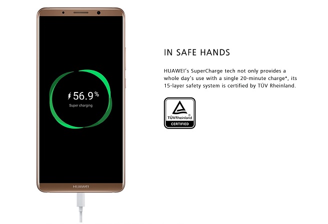 گوشیهای Huawei Mate 10 و Huawei Mate 10 Pro امنترین گوشیهای مجهز به تکنولوژی شارژ سریع (SuperCharge) دنیا هستند که گواهینامه امنیت TÜV Rheinland آلمان دریافت کردند و در تستهای مختلف امنیت باتری و شارژ سریع آنها تضمین شده است. تستهایی که شرکت TÜV Rheinland آلمان برای ارائه این گواهینامه به هوآوی در نظر گرفته شامل مواردی مانند تست شارژ سریع در 600 سیکل متوالی، شارژ نرمال گوشی در 1000 سیکل متوالی برای اطمینان از ایمنی عملکرد سیستم شارژ سریع و باتری گوشیها در استفاده طولانی مدت است.