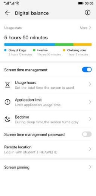 هوآوی در EMUI 9.0 همچنین امکاناتی برای تندرستی کاربران در نظر گرفته است تا از این طریق بتوانند زمان استفاده از گوشی های هوشمند خود را بهتر مدیریت کنند. در این رابط کاربری این امکان وجود دارد تا میزان زمان استفاده کاربران از هر نرم افزار بررسی و کنترل شود.