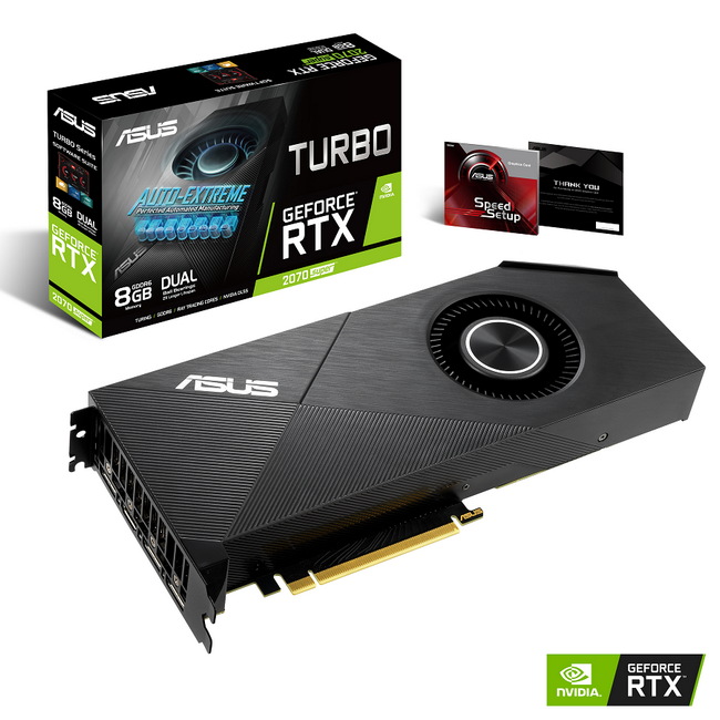 کارت گرافیک های Turbo GeForce RTX 2070 و 2060 SUPER EVOبا ابعادی کوچک و طراحی خنک کننده به صورت دمنده، وظیفه هدایت هوا را از جلوی سیستم و خروج آن از پشت کارت گرافیک را بر عهده دارند. این سری، بهترین گزینه برای استفاده در سیستم های رندرینگ و سرورهای مبتنی بر کارت گرافیک است. همچنین برای دوام بیشتر فن و افزایش طول عمر آن، ایسوس در هر دو مدل از فن های بلبرینگی دوگانه استفاده کرده است.