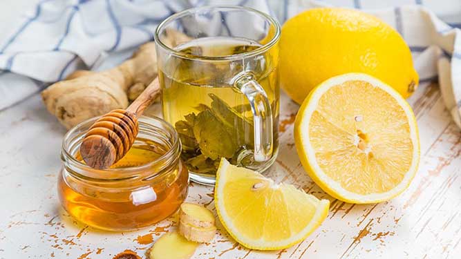 آب را در یک تابه گرم کنید، اما آن را به جوش نیاورید. اگر آب را بیش از حد گرم کردید، آن را کنار بگذارید تا کمی خنک شود. عسل طبیعی، لیمو، زنجبیل رنده شده را بهم بزنید.