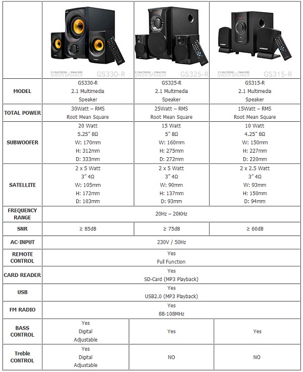 هر 3 مدل نیز از نوع 2.1ch و دارای یک ساب ووفر برای پاسخگویی فرکانسهای پایین یا به اصطلاح BASS و 2 اسپیکر Satellite برای پاسخگویی سایر فرکانس میباشند. این نوع پیکربندی در حال حاضر عامیانهترین و پرفروشترین نوع اسپیکر در بازار محسوب میشود. به گونهای که بسیار ایده آل برای پخش موسیقی و تا حدودی گیمینگ محسوب میشود. شاید برگ برنده این 3 مدل نسبت به اکثر مدلهای مشابه هم رده موجود در بازار برخورداری آنها از گیرنده رادیو FM با قابلیت جستجو و ذخیره سازی خودکار ایستگاههای رادیویی باشد.