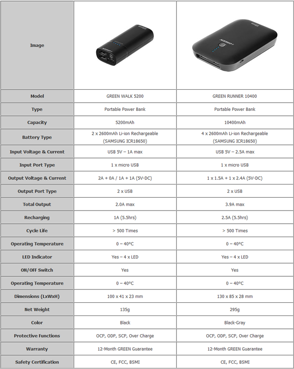 در ادامه میتوانید مشخصات فنی هر دو مدل پاوربانک گرین را در جدول زیر مشاهده نمایید: