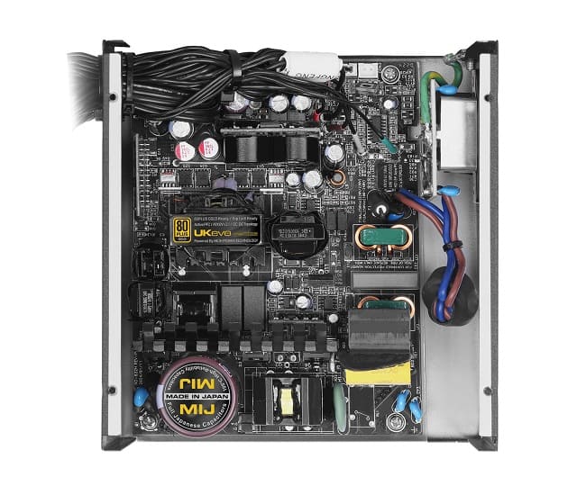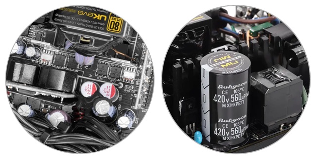 در ساخت GP600A-UK EVO V3.1 از خازنهای تمام ژاپنی با تحمل دمای ۱۰۵ درجه سانتیگراد ساخت کمپانیهای معتبر Rubycon و Nippon Chemi-Con استفاده شده است. این خازنها در مقایسه با مدلهای معمولی ۸۵ درجهای، تا چهار برابر عمر بیشتری دارند و مقاومت بالاتری در برابر ریپل جریان نشان میدهند.
