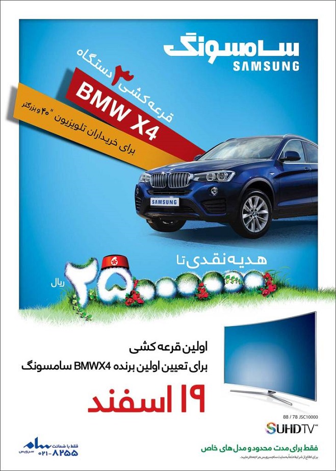 عیدانه سامسونگ شامل تخفیف نقدی تا 25 میلیون ریال برای خریداران تلویزیون است، علاوه بر این، سامسونگ سه دستگاه BMW مدل X4 را نیز به سه نفر از خریداران تلویزیونهای 40 اینچ و بالاتر به قید قرعه اهدا میکند. سامسونگ همچنین به خریداران برخی مدلهای حاضر در این جشنواره نوروزی، ساندبار و بلوری پلیر Blu-ray Player هدیه میدهد.