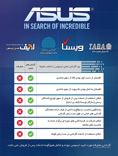 شرکت های مورد تایید ایسوس از فیلتر های کامل این شرکت عبور کرده اند و کاربران دیگر نگران مشکلات حاشیه ای این شرکت ها نیستند. همچنین مدت زمان گارانتی و خدمات پس از فروش محصولات را طبق قوانین بین المللی ایسوس، نظیر مدت زمان تعمیر، نحوه تعویض قطعه و خدمات دیگر را فقط شرکت های مورد تایید ایسوس در ایران به درستی رعایت می کنند. همچنین گاهی شرکت ایسوس برای خریداران خود مسابقه یا جشنواره های خرید با جوایزی متعدد در نظر می گیرد که این مسابقات و جشنواره ها مختص به محصولات با گارانتی رسمی ایسوس هستند. در نهایت توجه داشته باشید که گارانتی های شرکت های متفرقه مورد تایید ایسوس نبوده و شامل هیچگونه خدمات پس از فروش نمی باشند.