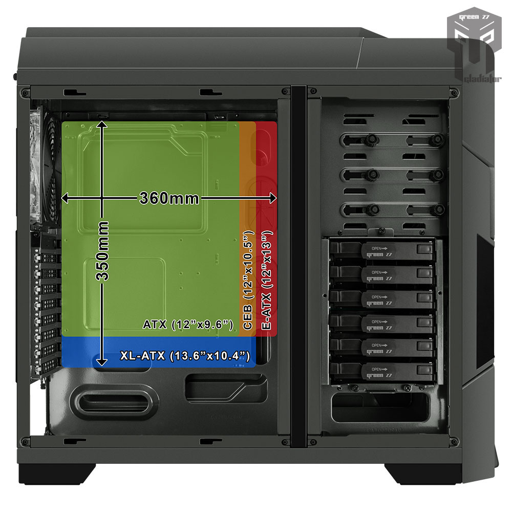 - قابلیت پشتیبانی از انواع مادربردهای حرفه ای در سایزهای XL-ATX, L-ATX, E-ATX, CEB, ATX که یک قابلیت کم نظیر برای این کیس (با توجه به قیمت بسیار مناسب آن) به شمار می رود.