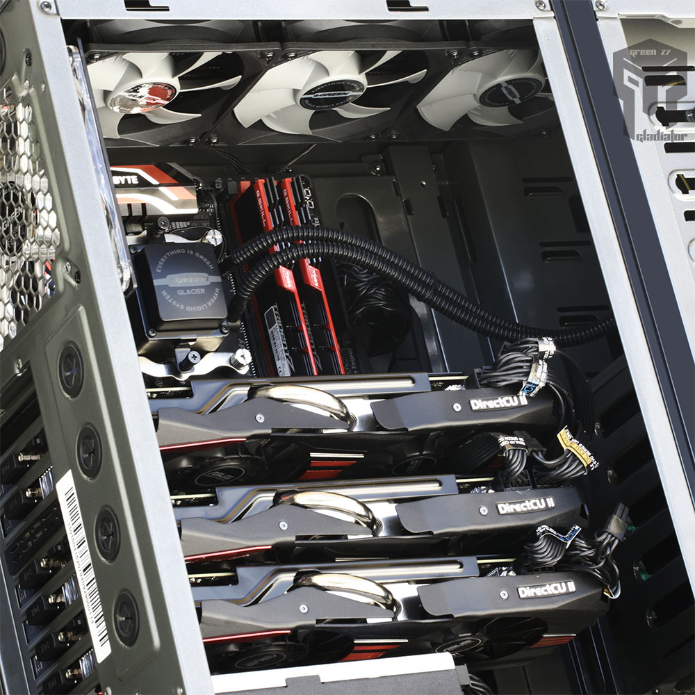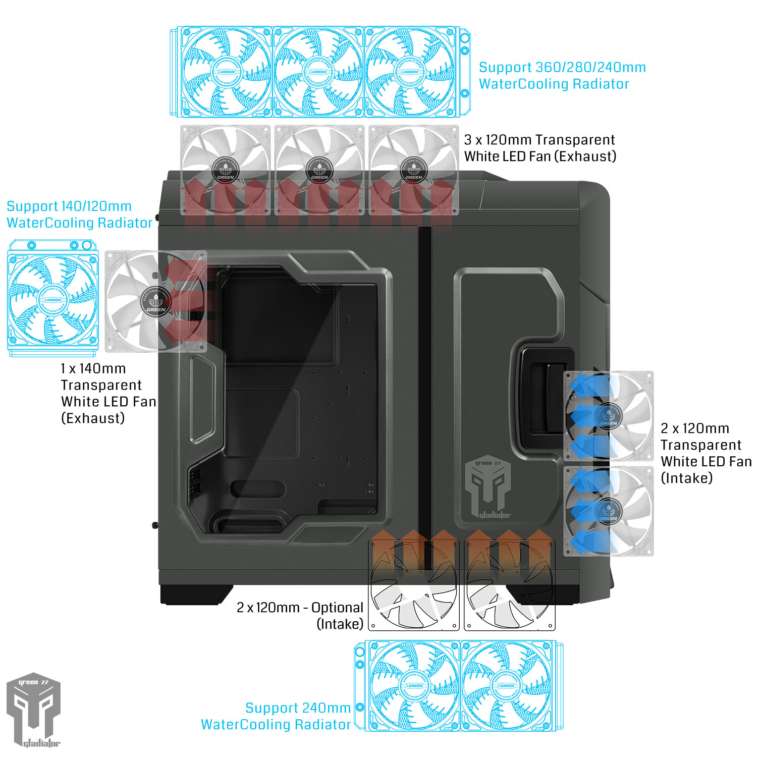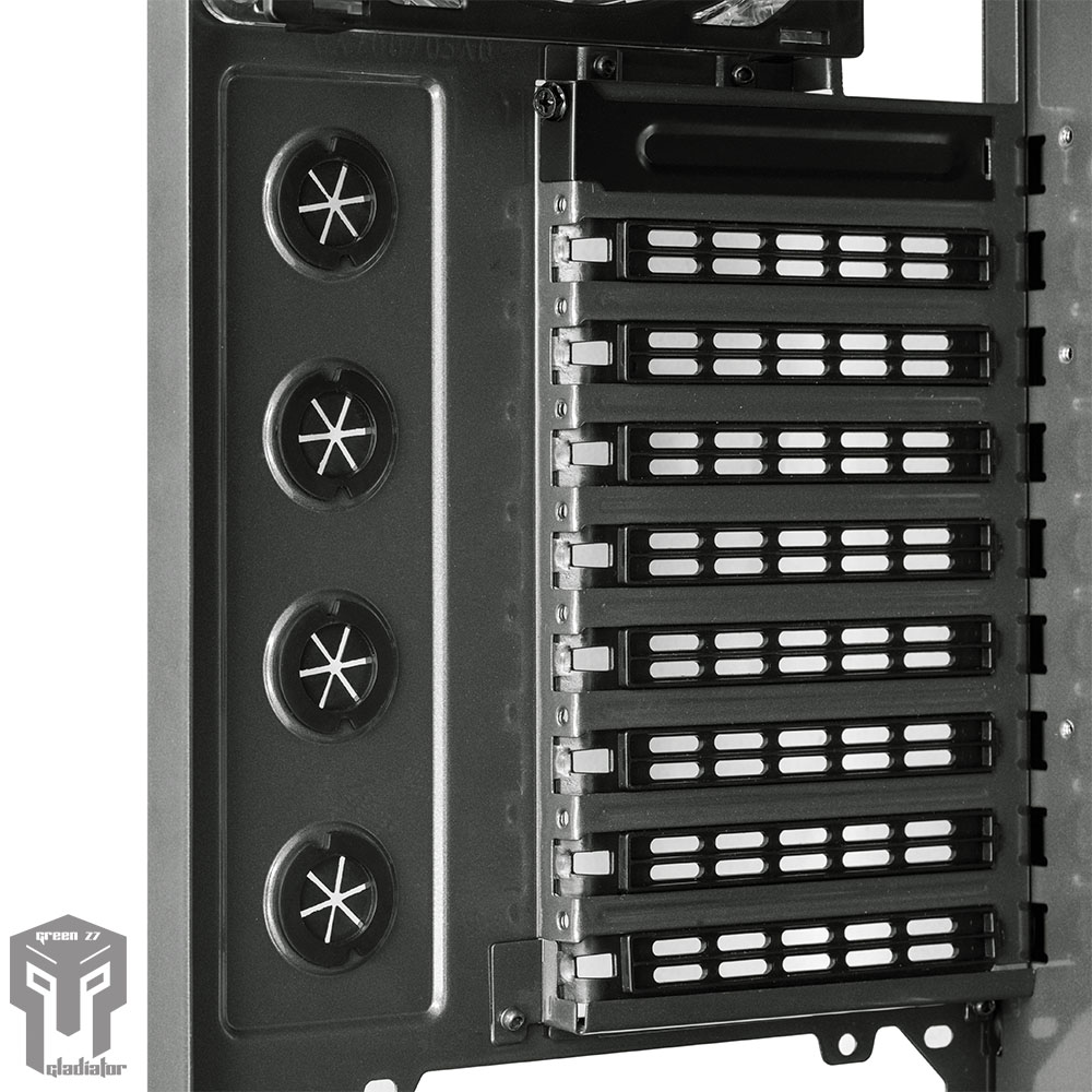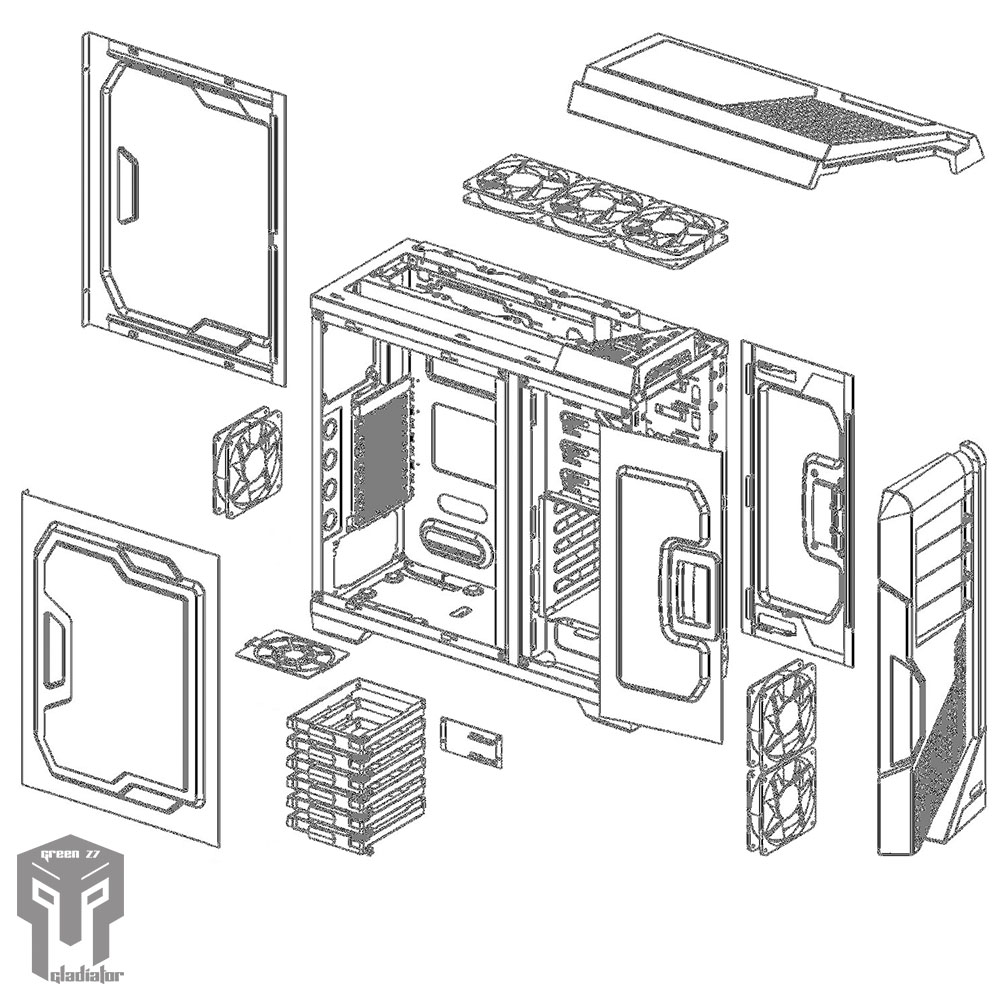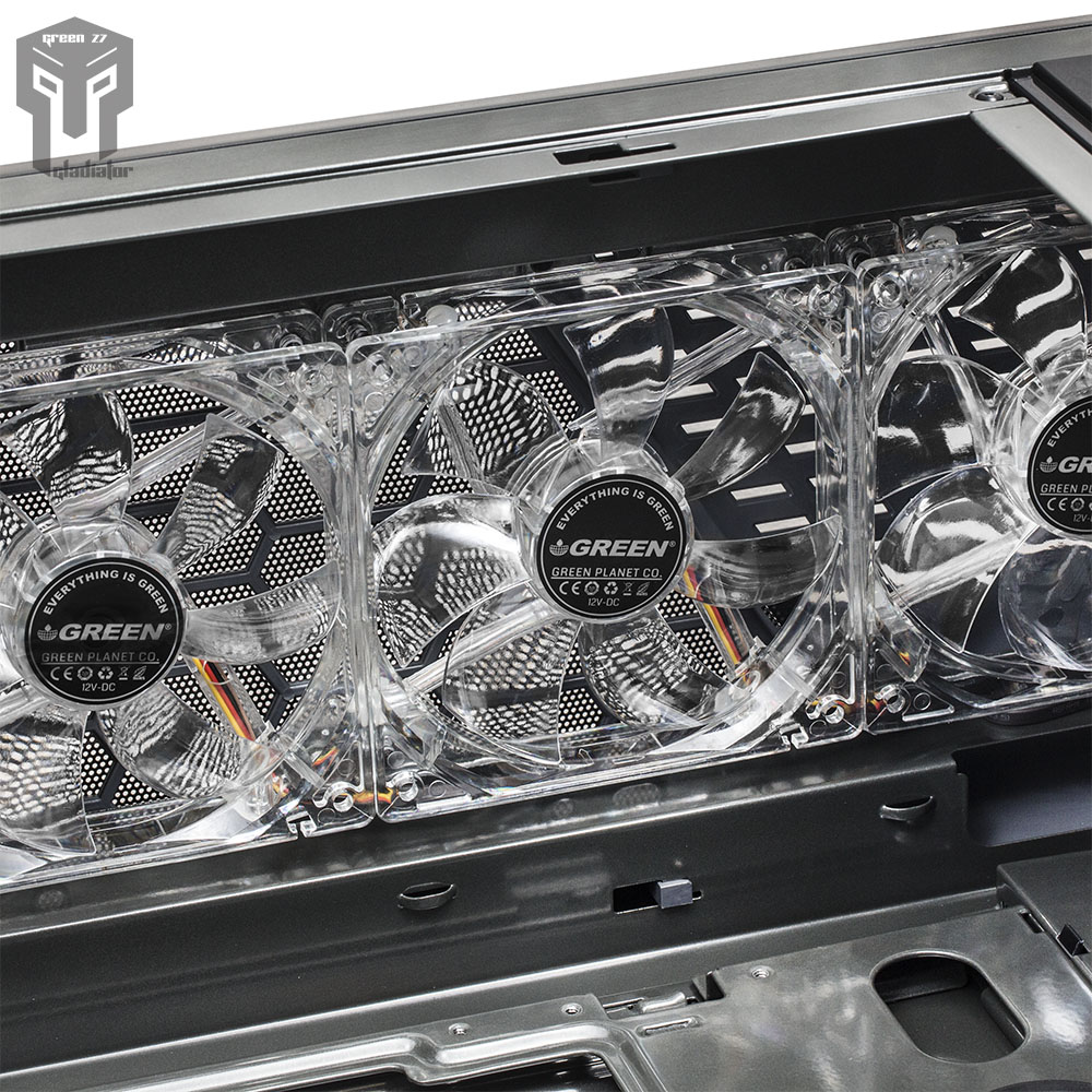 - کیس Z7 Gladiator گرین، مجموعا به همراه شش عدد فن با نور LED سفید عرضه می شود. (پنج عدد فن در سایز 120 میلی متر و یک عدد فن در سایز 140 میلی متر برروی این کیس نصب شده است)