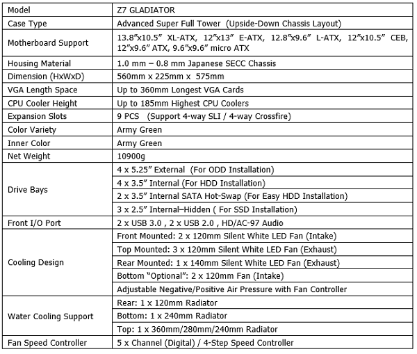 - کیس بزرگ و مستحکمZ7 Gladiator در سایز استاندارد Super Full-Tower طراحی و تولید شده است و دارای ابعاد بیرونی با ارتفاع 560 میلی متر و پهنای 225 میلی متر و عمق 575 میلی متر می باشد.