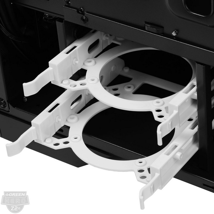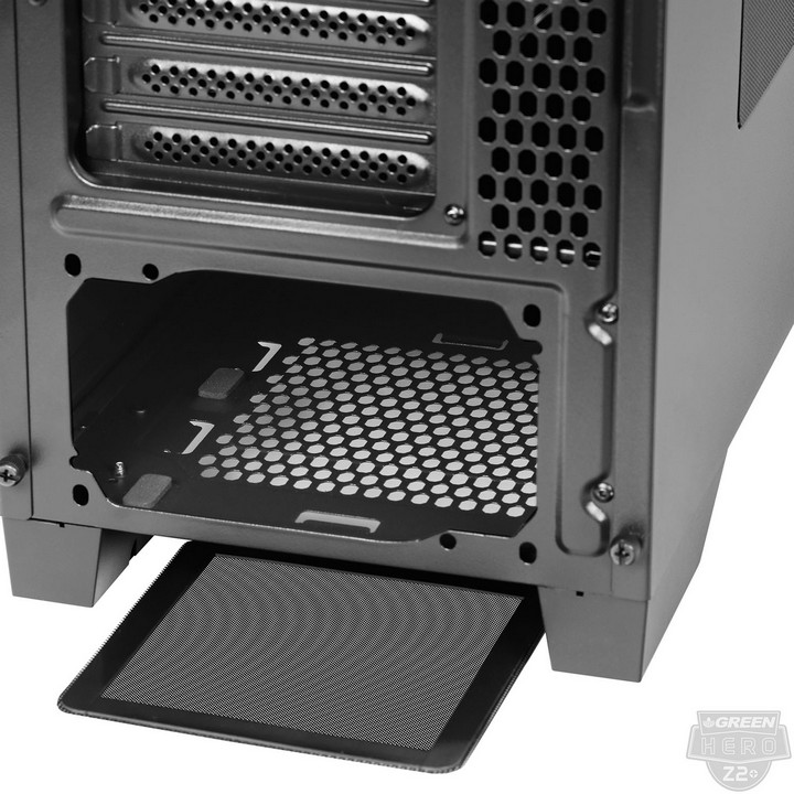 نکته جالب توجه در این بخش تعبیه فیلترهای مگنتی با قابلیت جداسازی سریع و آسان برای تمامی منافذ ورودی هوا در این کیس است که تأثیر فراوانی در جذب بیشتر و جلوگیری از ورود گرد و غبار به داخل کیس دارند. علاوه بر این براکت های تجهیزات ذخیره سازی در این کیس قابلیت نصب فن 8cm از نوع Slim را نیز دارا میباشند. این قابلیت مخصوصاٌ در هارددیسکهای با ظرفیت بالا که بهمراتب حرارت بیشتری نسبت به مدلهای رایج از خود متصاعد میکنند، راهکاری بسیار تأثیر گذار برای کنترل حرارت این مدلها محسوب میشود.