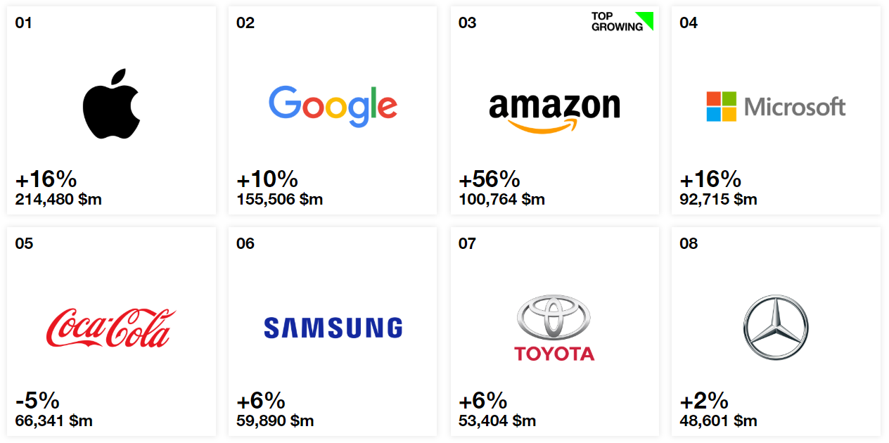 شرکت سامسونگ با رساندن ارزش برند خود به حدود ۶۰ میلیارد دلار توانست جایگاه خود را به عنوان ششمین برند برتر جهان تثبیت کند. در لیست جدید برترین برندهای جهان که توسط موسسه اینتربرند منتشر شده است، سامسونگ همانند سال ۲۰۱۷ در جایگاه ششم قرار دارد.