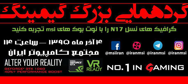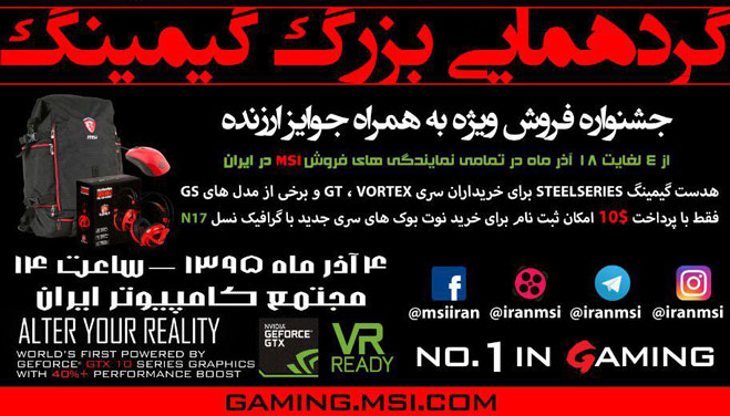 همانطور که میدانید و در اطلاعیه قبلی عنوان شد، بخش لپتاپهای گیمینگ MSI قصد دارد مراسم ویژهای را با محوریت گیمینگ و گیمرها در تهران برگزار کند. در این مراسم که چهارم آذرماه 95 در بازار کامپیوتر ایران برگزار خواهد شد، اتفاقات ویژهای در پیش خواهد بود.