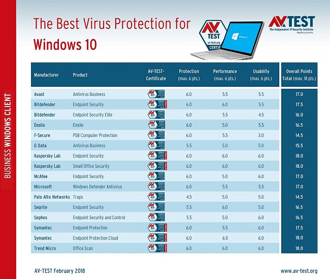 همچون بررسیهای پیشین صورت گرفته از سوی AV-TEST، این بررسی تازه نیز نشان میدهد که همچنان باید نرم افزارهای تولید شده توسط کمپانیهایی نظیر Kaspersky، Symantec و Trend Micro را به عنوان بهترین نرم افزارهای امنیتی در ویندوز 10 معرفی کنیم. در بالای این رده بندی نامهایی نظیر Endpoint Security و Small Office Security که از محصولات کمپانی Kaspersky هستند به چشم میخورد. این دو نرم افزار از یک موتور امنیتی مشابه بهره میبرند و به همین دلیل نمرات یکسانی را در بخشهای حفاظت، عملکرد و قابلیت استفاده بدست آوردهاند.
