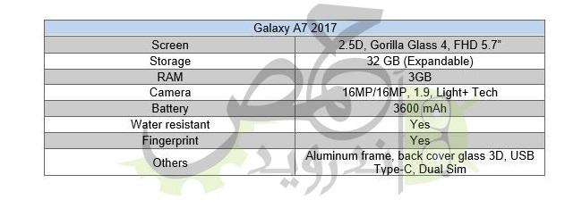 براساس دیگر اطلاعات موجود در این تصویر، به نظر میرسد که گوشی A7 2017 در کنار ویژگیهای بالا، دارای یک باتری با ظرفیت 3600 میلی آمپر ساعت، یک پورت USB Type-C، بدنهای تولید شده توسط آلومینیوم و شیشه، قابلیت پشتیبانی از دو سیم کارت و همچنین یک سنسور اثر انگشت نیز هست. لیست قطعات سخت افزاری منتشر شده همچنین نشان میدهد که این گوشی از یک ویژگی عالی دیگر یعنی بدنهای ضد آب نیز بهره میبرد. گفته میشود این گوشی قرار است همراه با سیستم عامل اندروید 6.0.1 مارشمالو عرضه شود و سامسونگ در اواسط سال آینده میلادی بهروز رسانی اندروید 7.0 نوقا را برای آن منتشر نماید.