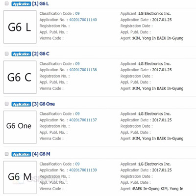 بر اساس گزارش تازه منتشرشده، شرکت الجی، نام تجاری G6 C، G6 L و G6 M را به ثبت رسانده است. همچنین، در کنار این مدل، نام تجاری الجی جی 6 وان نیز به ثبت رسیده است.