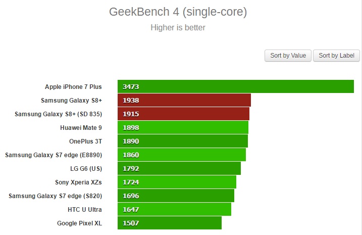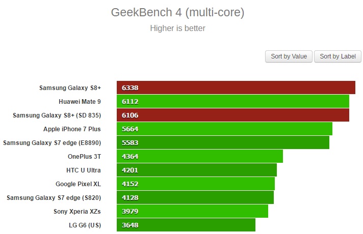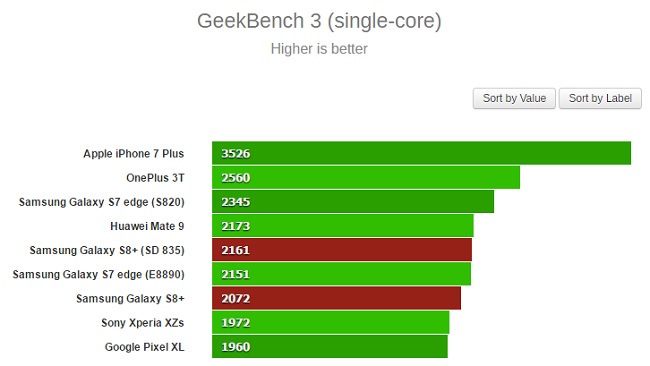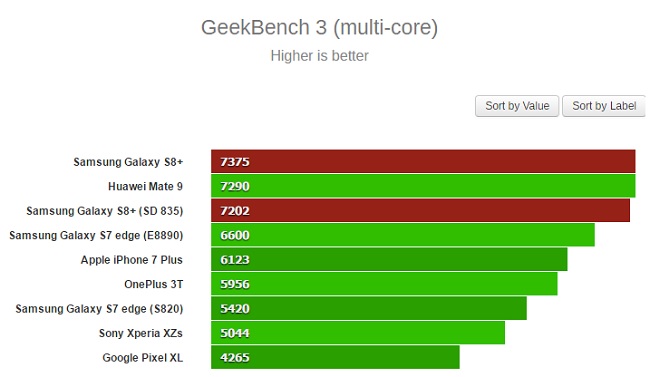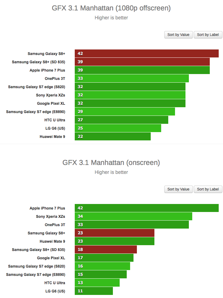 اما سایت معتبر GSMArena امروز نتایج چندین بنچمارک مختلف از عملکرد هستههای گرافیکی این دو پردازنده در نسخههای مختلف از گوشیهای گلکسی اس 8 را منتشر کرد. این بنچمارکها نشان میدهند که هسته Mali-G71 MP20 در تراشه Exynos 8895 از هسته Adreno 540 در تراشه اسنپدراگون 835 قویتر است و عملکرد بهتری را دارد. نکته جالبتر دیگر که میتوان در این بنچمارکها مشاهده کرد، امتیاز پایینتر هر دو نسخه از گوشیهای گلکسی اس 8 نسبت به نسخه اسنپدراگون از گلکسی اس 7 در بررسیهای به صورت تک هستهای است.