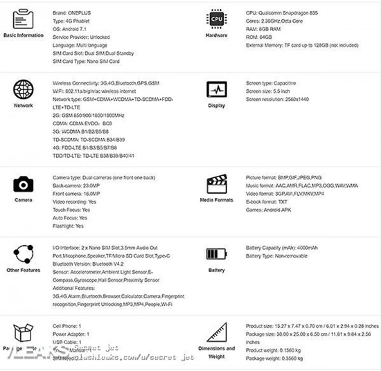 در لیست تازه منتشرشده از مشخصاتفنی OnePlus 5 مشاهده میشود که این گوشی پرچمدار به یک نمایشگر 5.5 اینچی Quad HD مجهز خواهد بود و هشت گیگابایت حافظه رم برای آن در نظر گرفته شده است. همچنین، گوشی پرچمدار جدید وانپلاس از چیپست اسنپدراگون 835 کوالکام با پردازنده هشت هستهای استفاده میکند و 64 گیگابایت حافظه داخلی آن تا 128 گیگابایت قابل ارتقا است.