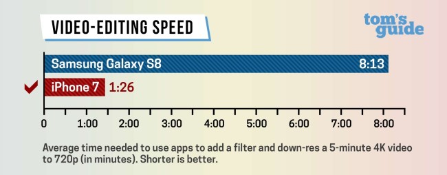 یکی از مواردی که پیشتازی آیفون ۷ به ثبت رسید، بررسی توانایی این دو گوشی هوشمند در ویرایش و تبدیل فایلهای ویدئویی با رزولوشن 4K بود. در این بررسی، آیفون ۷ اپل موفق شد فرایند اضافه کردن یک فیلتر ویدئویی و تبدیل فایلی با رزلوشن 4K به نمونه بهرهمند از رزولوشن اچدی را در زمان یک دقیقه و ۲۶ ثانیه به پایان برساند. در طرف مقابل، گلکسی اس ۸ موفق شد این فرایند را در مدت زمان ۸ دقیقه و ۱۳ ثانیه به سرانجام برساند.