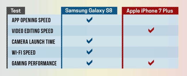 وبسایت Tom’s Guide مجموعه آزمایشهایی را تدارک دیده که در قالب آن، عملکرد آیفون ۷ اپل و گلکسی اس ۸ شرکت سامسونگ در آنچه شبیهسازی استفاده روزمره کاربران از این دو محصول خوانده شده، به چالش کشیده شده است. این آزمایشها در پنج بخش متفاوت انجام گرفته است.