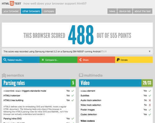 در آزمون HTML5Test، عمکلرد مرورگرهای وب سنجیده میشود و گلکسی نوت 8 به عنوان فبلت پرچمدار 2017 سامسونگ، بهتازگی در این آزمون فاش شده است. این محصول، موفق شده است تا امتیاز 488 را از 555 بهدست آورد؛ در مقایسه با محصولات دیگر، امتیاز بسیار خوبی به حساب میآید.