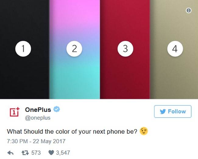 وان پلاس از چیزی حدود یک میلیون فالوور توییتری خود درخواست کرده تا رنگهای ترجیحی خود برای وان پلاس ۵ را انتخاب کنند. در توییت ماه می، این شرکت رنگهایی نظیر سیاه، قرمز، طلایی و ترکیبی از سبز/آبی/بنفش (که بعدها از آن با عنوان رنگ یونیکورن یاد شد) را در لیست پیشنهادیاش قرارداد.