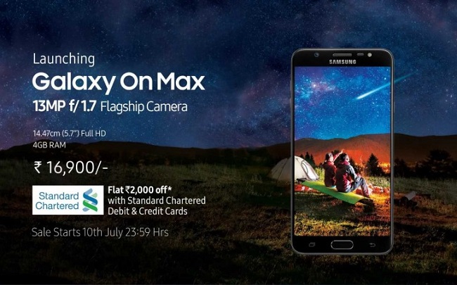 دوربینهای اصلی و ثانویه این گوشی نیز توسط دو سنسور 13 مگاپیکسلی پشتیبانی میشوند. دوربین اصلی دارای روزنه f/1.7 است اما دوربین سلفی علاوه بر روزنه در حد f/1.9 دارای یک فلش LED نیز هست تا برای عکسبرداری در موقعیتهای تاریک نیز مناسب باشد. دوربین این گوشی همچنین دارای یک مد کاری جدید با نام Social Camera است که به کاربران اجازه میدهد عکسهای سلفی خود را به استیکر تبدیل کنند. پشتیبانی از سرویس پرداخت Samsung Pay Mini دیگر ویژگی مشترک این گوشی و گوشی J7 Max است که در حال حاضر تنها در چند کشور خاص در دسترس کاربران قرار دارد. دیگر ویژگی مهم این گوشی سنسور اثر انگشت است که به صورت یکپارچه در درون دکمه Home آن جایگذاری شده است. انرژی موردنیاز گوشی گلکسی On Max نیز توسط یک باتری با ظرفیت 3300 میلی آمپر ساعتی تامین میشود.