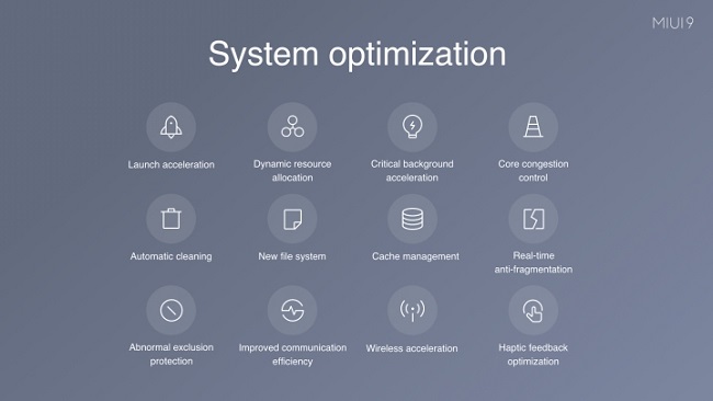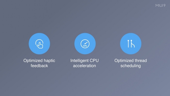 رابط کاربری MIUI 9 همچنین دارای یک Launcher هوشمند برنامه است و موجب میشود که با توجه به محتویات نمایش داده شده بر روی صفحه نمایش امکان انتخاب سریع برنامههای مرتبط و کاربردی ممکن باشد. شیائومی همچنین اعلام کرده است که رابط کاربری جدید این کمپانی موجب میشود که زمان لازم برای اجرای برنامهها به میزان قابل توجهی کاهش پیدا کند. ارتقا سیستم مدیریت حافظه کش، قابلیتهای جدید و مختلف برای بهینهسازی اسمارت فون و همچنین سیستم جدید در اختصاص دادن میزان متغیری از حافظه رم و پردازنده برای اجرای یک برنامه خاص، از دیگر ویژگیهای این رابط کاربری است که سبب میشود کاربران در هنگام کار با گوشی هوشمند خود شاهد بهبود قابل توجه عملکرد آن باشند.