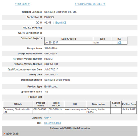 پیش از آنکه بیش از حد هیجانزده شوید، باید گفت که تأییدیه بلوتوث برای یکی از گوشیهای سامسونگ با شماره مدل G888N0 بهدست آمده است. شماره مدل فاش شده با هیچیک از محصولات پیشین سامسونگ مطابقت ندارد و حتی در شایعات گذشته، اشارهای به عرضه این مدل نشده است. به همین جهت، احتمالاً محصول فاش شده مربوط به گوشی گلکسی X است که شماره مدل آن با محصولات پیشین این سازنده همخوانی ندارد.