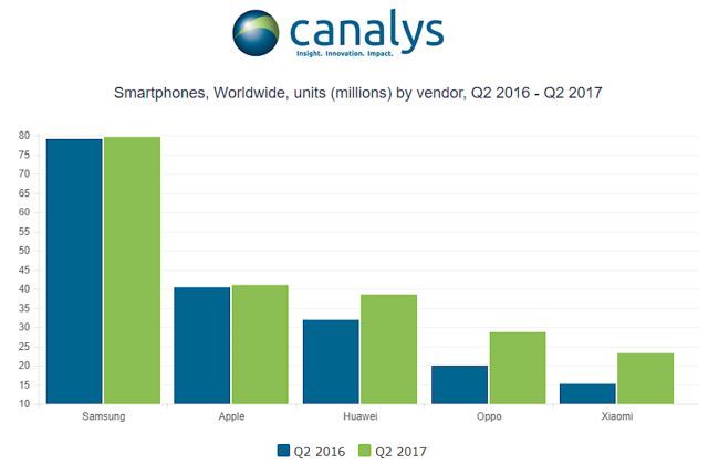 گزارش جدید محققان Canalys حکایت از آن دارد که میزان فروش آیفون اپل در سه ماهه دوم سال ۲۰۱۷ میلادی، در مقایسه با مدت مشابه در سال پیش از آن تنها دو درصد افزایش یافته است. در مقام مقایسه، هواوی موفق شده با رشد ۲۰ درصدی، ۳۸ میلیون گوشی هوشمند به فروش برساند تا به آمار ۴۱ میلیون گوشی هوشمند شرکت اپل نزدیک شود. همانطور که در نمودار مشاهده میکنید سامسونگ نیز با فروش ۷۹ میلیون گوشی هوشمند رشد چندانی را شاهد نبوده است. این در حالی است که شرکتهای آسیایی نظیر Oppo و شیائومی موفق شدهاند به ترتیب رشد ۴۴ و ۵۲ درصدی را در میزان فروش خود به ثبت برسانند.