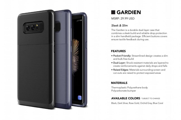 براساس اطلاعات بهدست آمده، کیسهای گلکسی نوت 8 به طراحی بدون حاشیه این فبلت ردهبالا اشاره میکند؛ همچنین، انحنای گوشههای گلکسی نوت 8 کمتر از گلکسی اس 8 و گلکسی اس 8 پلاس خواهد بود و طراحی مستطیلشکل، به خود گرفته است. پرچمدار جدید سامسونگ با نمایشگر 6.3 اینچی با نسبت ابعاد 2 به 1 راهی بازار خواهد شد و فاقد دکمه فیزیکی Home است. همچنین، گلکسی نوت 8 به دوربین دوگانه مجهز شده است که رندرهای جدید، جایگیری سنسورهای دوربین را تأیید میکند.