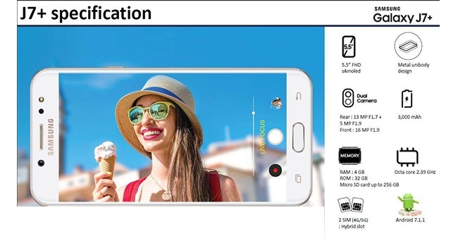 صفحه نمایش 5.5 اینچی با وضوح 1920 در 1080 پیکسلی، یک پردازنده هشت هستهای با سرعت 2.4 گیگاهرتز، چهار گیگابایت حافظه رم، 32 گیگابایت حافظه داخلی همراه با یک پورت microSD و باتری با ظرفیت 3000 میلی آمپر ساعت دیگر ویژگیهای مهم گوشی گلکسی J7 پلاس را تشکیل خواهند داد. سامسونگ همچنین برای این گوشی بدنه تمام فلزی، یک دوربین سلفی و ثانویه 16 مگاپیکسلی با روزنه f/1.9، سیستم عامل اندروید 7.1.1 نوقا، پشتیبانی همزمان از دو سیم کارت و دستیار هوشمند Bixby را در نظر گرفته است.